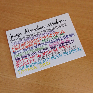 Postkarte mit Tipps, wie man junge Menschen auf ihrem Weg stärken kann.